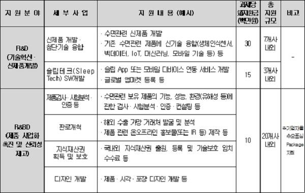 우선 ‘R&D’분야에서는 수면에 관한 신제품을 개발하거나 기존 제품에 첨단기술 융합에 업체 당 최대 3천만 원까지 지원한다. 단, 슬립 어플 등 소프트웨어 개발은 1천5백만 원까지 지원이 가능하다.