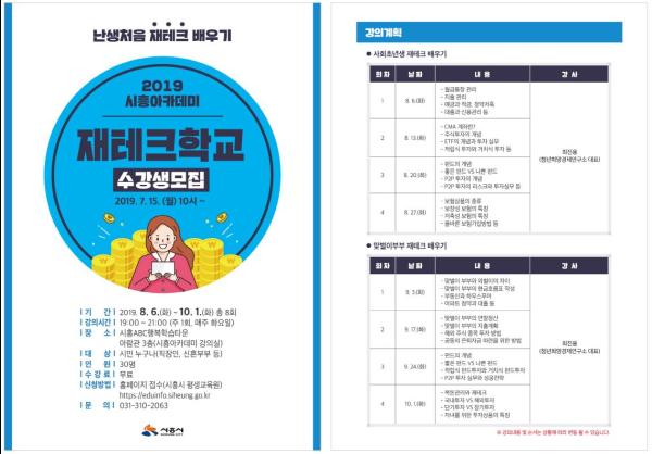 시흥시는 오는 8월 6일부터 10월 1일까지 총 8회에 걸쳐 재테크학교를 운영한다”고 밝혔다.