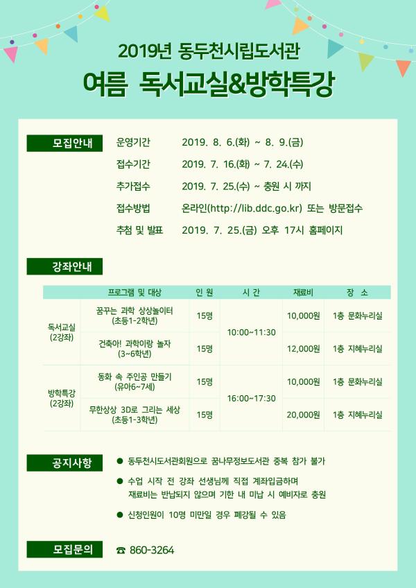 동두천시 시립도서관은 여름방학을 맞이해 초등학생을 대상으로 오는 8월 6일부터 9일까지 여름독서교실 및 방학특강 4개 강좌를 운영한다.