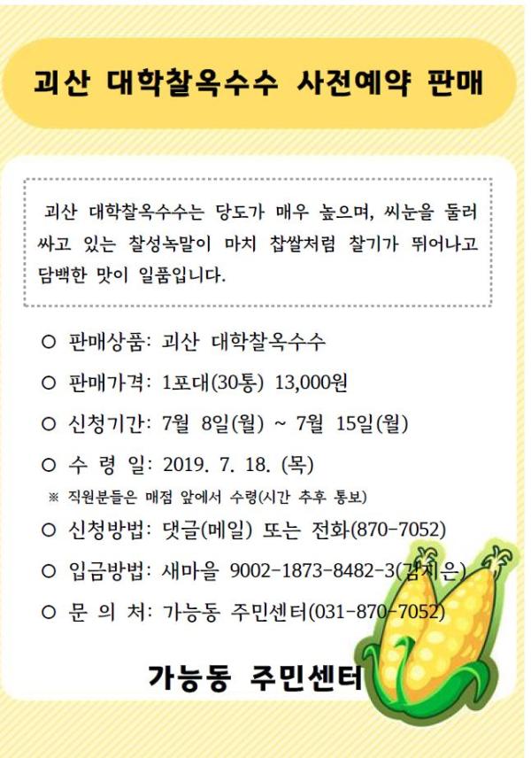 나눔장터와 옥수수 사전예약에 관련한 사항은 가능동를 통해 문의하면 된다.