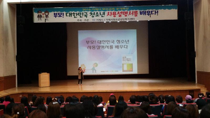 거제시는 청소년상담복지센터 주관으로 지난 26일(화), 거제시청소년수련관 1층 대공연장에서 학부모 400여 명이 참여한 가운데 이진아 브랜드유리더십센터 소장을 초빙하여 [부모! 대한민국 청소년 사용설명서를 배우다! ] 라는 주제로 부모교육 공개특강을 실시했다.