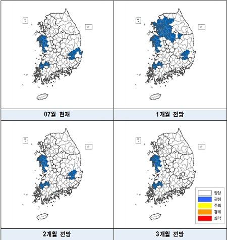 정부는 최근 평년대비 누적 강수량 부족과 지역별 편차로 인해 일부 지역을 가뭄 관심단계로 지정하고, 향후 장마 등 강수 진행상황을 면밀히 살피겠다고 밝혔다.