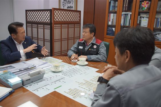 | 거제 대우조선노동조합 매각대책위원회 위원들과 논의 중인 김한표 국회의원 |