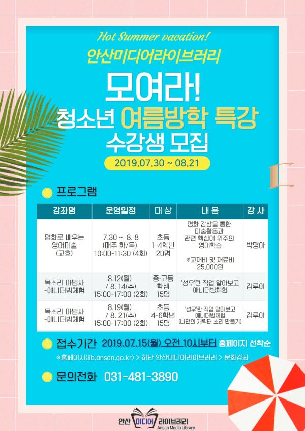안산시는 여름방학을 맞은 청소년들을 대상으로 안산미디어라이브러리에서 영어·미디어 특별강좌를 운영한다고 11일 밝혔다.