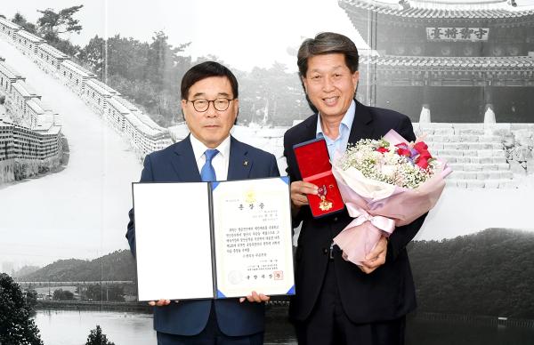 광주시는 지난 10일 시장실에서 6·25전쟁에 참전해 무공을 세운 참전용사 정면수씨의 아들 정하송씨에게 부친의 화랑무공훈장을 전수하는 전달식을 개최했다.