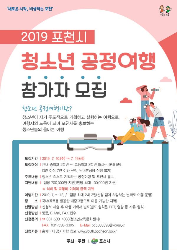 포천시 청소년교육문화센터가 ‘2019년 포천시 청소년 공정여행’ 참가 청소년을 모집한다.