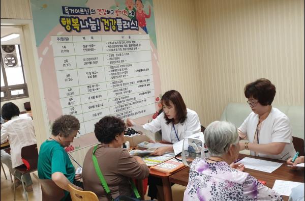 “행복나눔 건강플러스”는 독거노인의 건강수준 향상을 위해 경로당을 찾아가 기초·정신 건강관리, 사회활동 증진, 규칙적 운동, 보건·복지서비스 연계, 안전관리의 6가지 영역의 통합건강관리 서비스다.