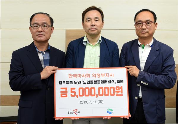 의정부시는 11일 복지환경국장실에서 임영순 복지환경국장, 진귀환 한국마사회 의정부지사장 및 관계자가 참석한 가운데 의정부 관내 저소득층 노인을 위한 노인돌봄종합서비스 후원금 전달식을 가졌다.