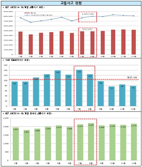 도로교통공단에 따르면, 최근 5년간 7~8월 기간 교통사고는 총 971,323건이 발생하였으며, 이로 인해 3,606명의 사망자와 1,567,156명의 부상자가 발생했다.