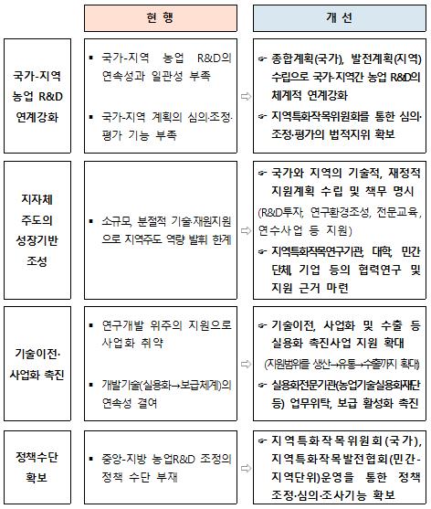 그 외 다양한 성공 사례들은 국가와 지방간 R&D 협업이 매우 중요하고 효율적이라는 점을 시사하고 있으나, 현재 지역농업의 R&D 여건은 매우 열악한 상황이다.