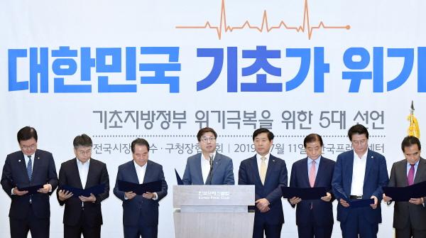전국시장군수구청장협의회는 11일 서울 한국프레스센터에서 기자회견을 열고, “재정분권, 자치경찰제, 교육자치 등 기초지방정부 이해와 직결된 정책 결정 과정에서 기초지방정부가 지속해서 소외되고 있다”고 우려하며 ‘기초지방정부 위기극복을 위한 5대 선언’을 발표했다.
