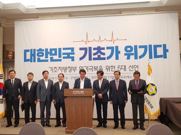 한편 전국시장군수구청장협의회는 기자회견에 앞서 같은 장소에서 민선7기 2차년도 제1차 공동회장단회의를 열어 임원을 선출하고, 현안을 논의했다.