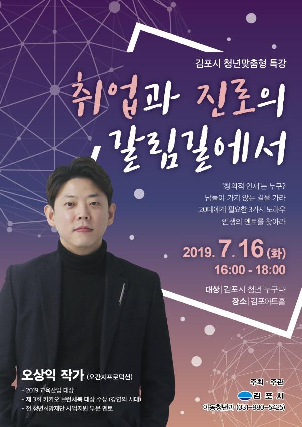 김포시는 취업과 진로의 갈림길에 있는 청년들의 고민해결을 위한 ‘청년맞춤형 특강’을 오는 16일 오후 4시 김포아트홀 3층 공연장에서 개최한다.