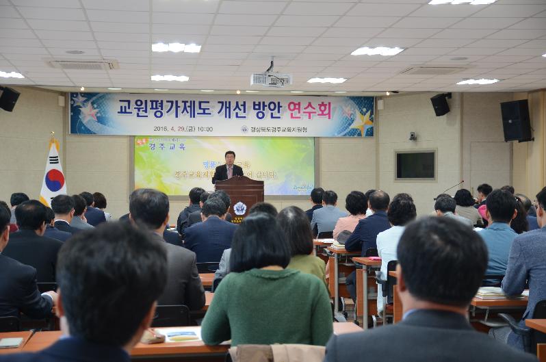 경주교육지원청(교육장 구종모)은 2016년 4월 29일(금) 대회의실에서 관내 유초중·고·특수학교 교감이 참석한 가운데, ‘교원평가제도 개선에 따른 연수회’를 개최했다.