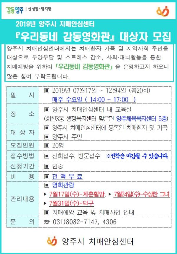 양주시 치매안심센터는 오는 17일부터 12월 4일까지 매주 수요일 ‘우리동네 감동영화관’을 운영한다.