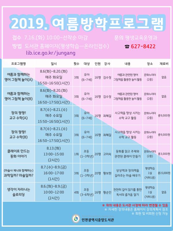 인천광역시중앙도서관은 오는 8월 6일부터 21일까지 유아·초등학생을 대상으로 ‘2019 여름방학 프로그램’을 운영한다.