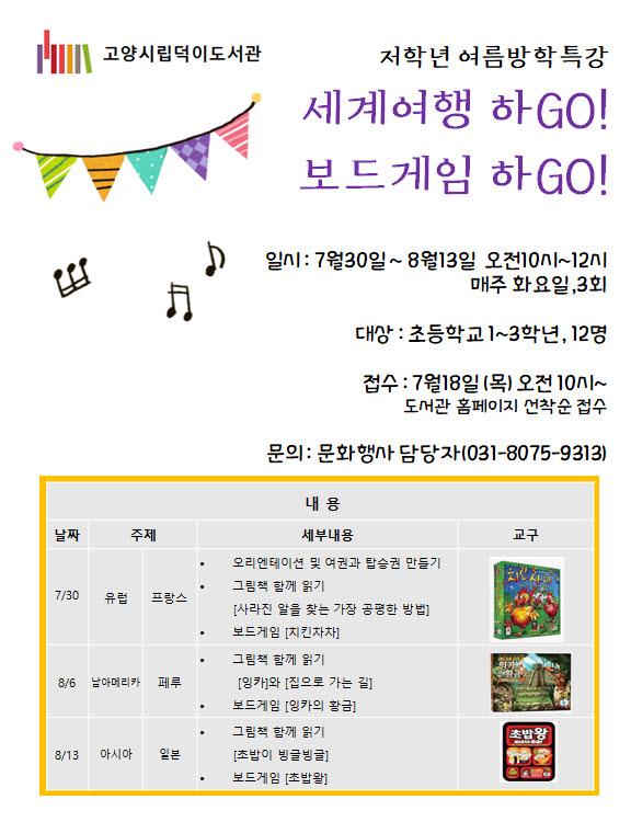 고양시 덕이도서관은 오는 30일부터 8월 13일까지 매주 화요일, 초등 저학년을 대상으로 여름방학특강 ‘세계여행 하GO 보드게임 하GO’ 강좌를 운영한다.