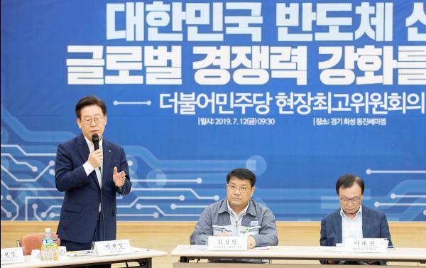 이재명 지사는 12일 화성에 있는 반도체 소재기업에서 열린 더불어민주당 현장 최고위원회에서 이같이 말하면서 “경기도는 현재 실태조사, TF팀 구성, 긴급자금지원 등 긴급대책을 수립하고 있는데 장기적으로 안정적 공급 체계를 만드는 데 적극 노력하겠다”고 말했다.