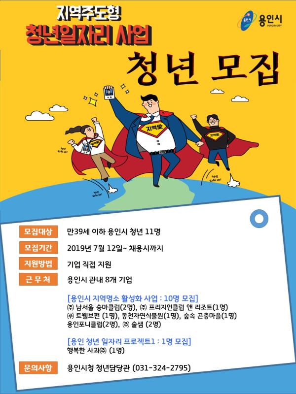 이는 행정안전부의 지역주도형 청년일자리사업에 따른 것으로 용인 지역명소 활성화 추진단 사업을 통해 관광기업에 10명, 용인청년 일자리창출 프로젝트로 사회적경제기업에 1명을 채용한다. 해당 기업엔 용인청년 채용인원 1인당 매달 약160만원의 인건비와 직무교육비 등을 일정기간 동안 지원한다.