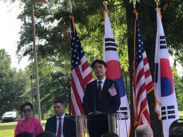 김 시장은 기조연설에서“오늘 제막식 참석에 앞서 맥아더공원 내에 있는 한국전쟁 기념관과 참전용사비에 헌화하고, 생존해 있는 참전용사 두 분을 직접 만나 감사의 인사를 드렸다”며, 직접 참전 용사 두 명의 이름을 부르며 아칸소주 전사자 461명에 대한 감사와 존경의 마음을 표했다.