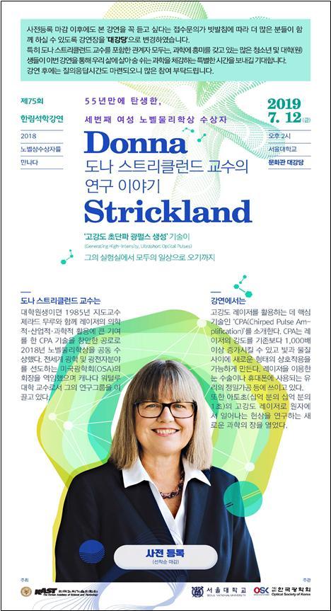스트리클런드 교수는 대학원생이던 1985년 지도교수 제라드 무루와 함께 레이저의 의학적·산업적·과학적 활용에 큰 기여를 한 CPA기술을 창안했으며, 이를 바탕으로 지난해 역사상 세 번째이자 55년 만에 물리학분야에서 탄생한 여성 노벨상 수상자의 주인공이 됐다.