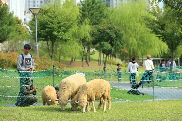 늘솔길공원 양떼목장은 지난 2014년 친환경 공원잔디 관리를 위해 면양 7마리를 도입해 개장했다. 현재 출산 등으로 양 수가 늘어 26마리의 면양이 양떼목장에서 생활하고 있다.