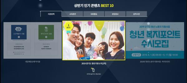 가장 많은 관심을 받은 정책은 ‘2019 경기도 청년 기본소득’이었고, ‘2019 청년노동자 지원사업-복지포인트’, ‘청년구직활동지원금’이 그 뒤를 이었다.