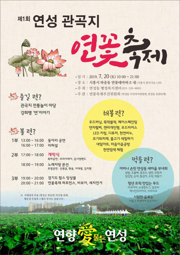 시흥시 연성동행정복지센터에서는 오는 20일 토요일 오전 10시부터 오후 9시까지 연꽃테마파크 일원에서 주민들과 함께 즐겁고 맛있는 먹거리가 있는 연 향기 가득한‘제1회 연성 관곡지 연꽃축제’를 개최한다.