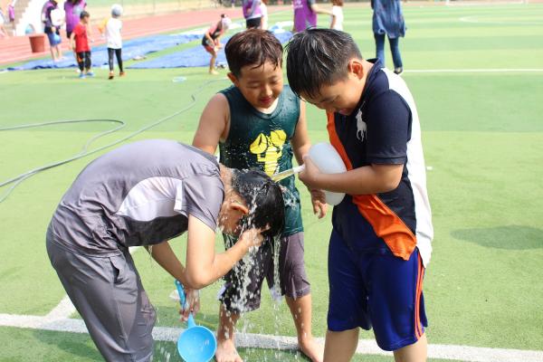 상쾌 놀이터는 단순한 물놀이가 아닌 약 20m 길이의 비닐 스피드 트랙을 직접 만들어 천연 비눗물을 뿌린 곳을 슬라이딩해보는 물놀이터로 구성됐다. 트랙을 통과할 때는 스프링클러로 물분수를 만들어주어 아이들뿐 아니라 함께 온 부모들도 즐길 수 있었다.