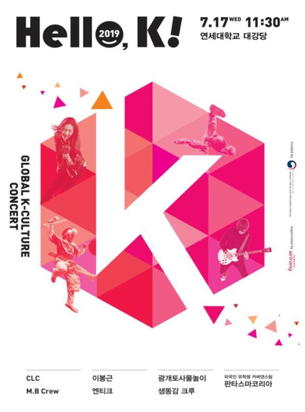 문화체육관광부 해외문화홍보원은 국제방송교류재단과 함께 오는 17일 오전 11시 30분 연세대 대강당에서 주한 외국인 유학생을 대상으로 찾아가는 문화 공감 콘서트 ‘2019 헬로, 케이’를 진행한다.