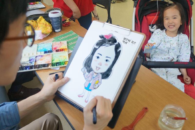 | “정은이의 꿈은 의사~”. 만화작가가 부천성모병원 소아병동에 입원하고 있는 의사가 꿈인 소아 환아의 캐리커처를 그리고 있다. |