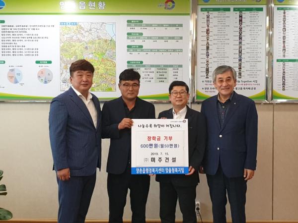 양촌읍에 위치한 ㈜미주건설이 15일 관내 저소득 학생들을 위해 써달라며 장학금 600만 원을 양촌읍행정복지센터에 기탁했다.