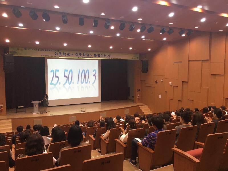 경기도광명교육지원청(교육장 박상길)은 지난 29일 오후 3시부터 광명시청소년수련관 4층 대공연장에서 통합교육 내실화 및 통합학급 교원 역량 강화를 위해 ‘이웃학교, 이웃학급 통합이야기!’라는 주제로 2016 유․초․중․고 통합학급 교사 연수를 2시간에 걸쳐 실시하였다.