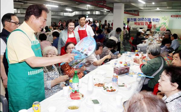 이날 백군기 용인시장도 행사장을 방문해 어르신들에게 삼계탕을 나눠드리며 건강을 기원했다.