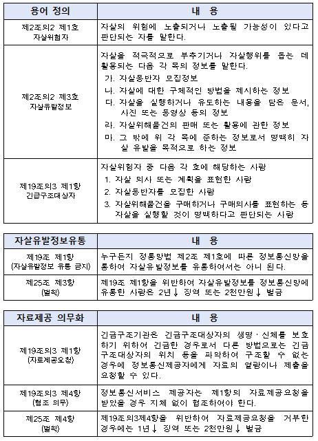 그동안 온라인에서 유통되는 자살유발정보에 대한 직접적인 처벌 법규가 없었지만, 이번 개정안에 온라인상 자살유발정보를 불법정보로 규정하고, 이를 유통하는 경우 처벌한다는 내용이 포함됨에 따라 단속 근거가 마련됐다.