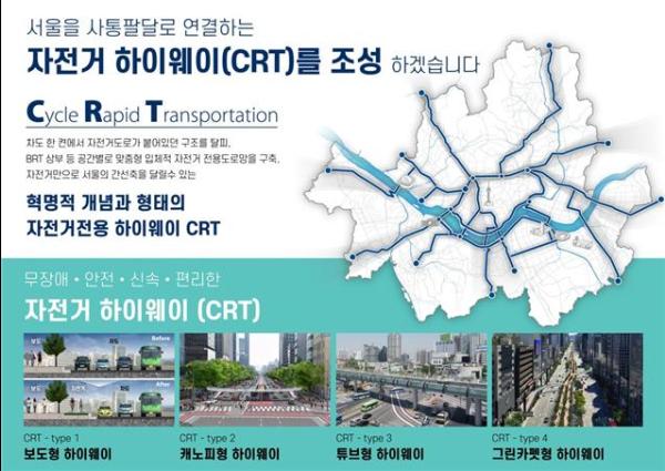 항구 위 공간에 만든 코펜하겐의 자전거 고가도로 ‘사이클 스네이크’, 열차 지상역사 상부 공간을 활용해 건설 예정인 런던의 ‘스카이 사이클’ 처럼 서울형 자전거 하이웨이 CRT를 만들어 사통팔달 자전거 간선망을 구축한다는 구상이다.