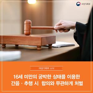 여성가족부는 13세 이상 16세 미만 아동·청소년의 궁박한 상태를 이용해 간음·추행 시 처벌하고, 위계·위력에 의한 13세 미만 아동·청소년대상 간음·추행죄의 공소시효 폐지를 주요 내용으로 하는 ‘아동·청소년의 성보호에 관한 법률’이 오는 16일부터 시행된다고 밝혔다.
