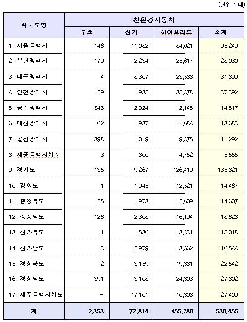 미세먼지 감축을 위한 정부의 친환경차 보급 확대와 고연비에 대한 국민들의 높은 관심에 따라 전기차는 72,814대를 등록해 1년 만에 약 2배, 수소차는 2,353대로 약 6.6배, 하이브리드차는 455,288대로 약 1.3배 각각 증가한 것으로 나타났다.