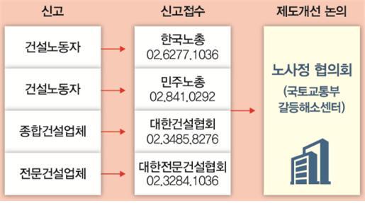또한, 신고의 편의를 위해 건설노동자는 양대노총 건설노조, 종합건설업체는 대한건설협회, 전문건설업체는 대한전문건설협회로 신고창구를 다원화해 운영한다.