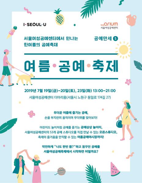 서울시에서 운영하는 서울여성공예센터 더아리움에서 오는 19일부터 20일, 23일 오후 1시부터 오후 9시, 2019 서울여성공예축제 ‘공예만세5 ‘여름.공예.축제’’를 개최한다.