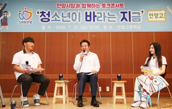 안양시가 민선7기 출범 1주년을 맞아 지난 12일 안양고등학교에서 130여명의 청소년과 함께 토크콘서트‘청·바·지’를 개최했다.