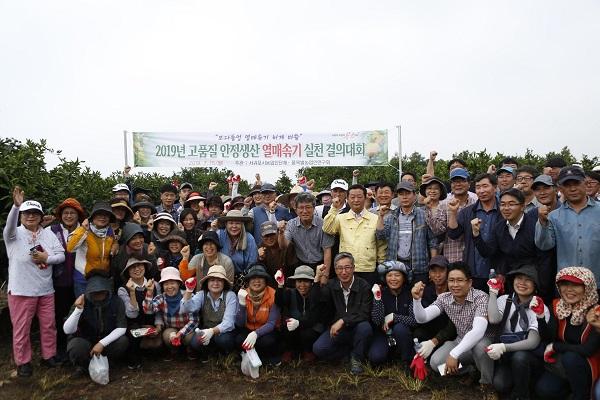 제주특별자치도농업기술원 서귀포농업기술센터는 15일 남원읍 한남리 오병국 농가 감귤원에서 서귀포시농업인단체, 품목별연구회, 농업인, 농감협 등 200여 명이 참석한 가운데 ‘2019년 고품질감귤 안정생산 열매솎기 실천 및 결의대회’를 개최했다고 밝혔다.