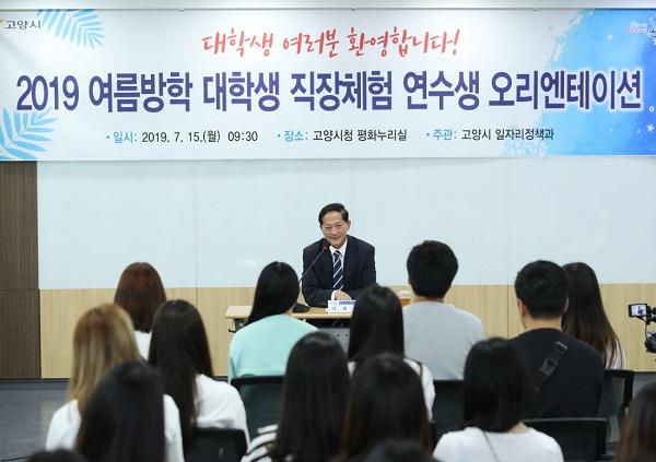 경기도 고양시는 지난 15일 고양시청 평화누리실에서 ‘2019 여름방학 대학생 공공기관 직장체험’ 연수생 77명을 대상으로 연수 오리엔테이션 및 맞춤형 교육을 실시했다.