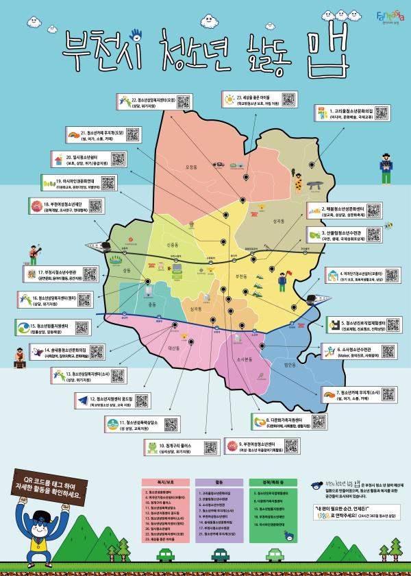 지도에는 청소년이 자유롭게 이용할 수 있는 부천시 내의 수련원 · 문화의집, 카페, 상담복지센터 · 성폭력상담소, 쉼터, 법률지원센터 · 다문화지원센터 등 23개 청소년시설·단체의 각종 정보를 담았다.