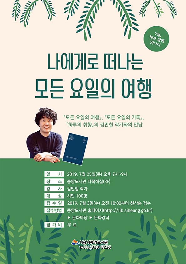 오는 25일 목요일 저녁 7시, 시흥시중앙도서관 다목적실에서 ‘7월, 책과 함께 만나다’ 김민철 작가와의 만남이 진행된다. ‘모든 요일의 여행’, ‘모든 요일의 기록’,‘하루의 취향’등을 펴낸 작가가 ‘나에게로 떠나는 모든 요일의 여행’이라는 주제로 이야기를 들려줄 예정이다.