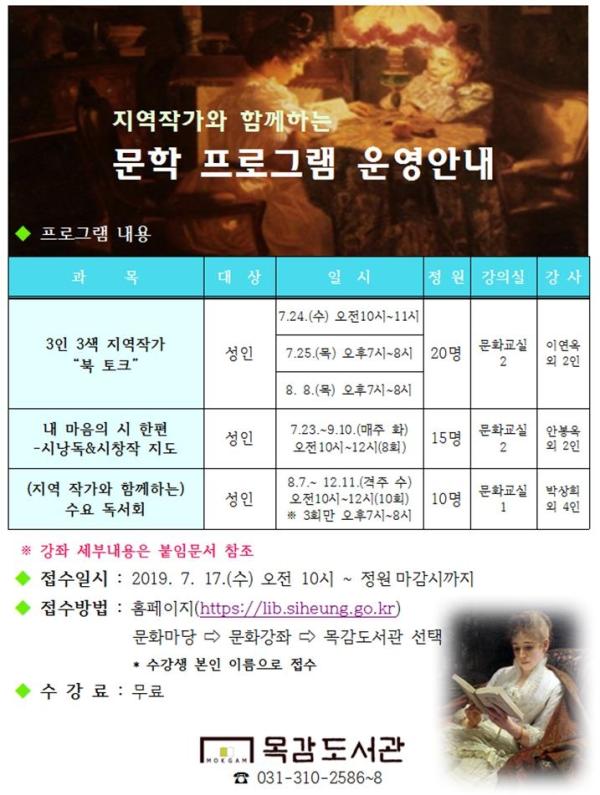 시흥시 목감도서관은 7월부터 오는 12월까지 6개월간 한국문인협회소속 시흥시 작가들과 함께하는 다양한 문학 프로그램을 운영한다.