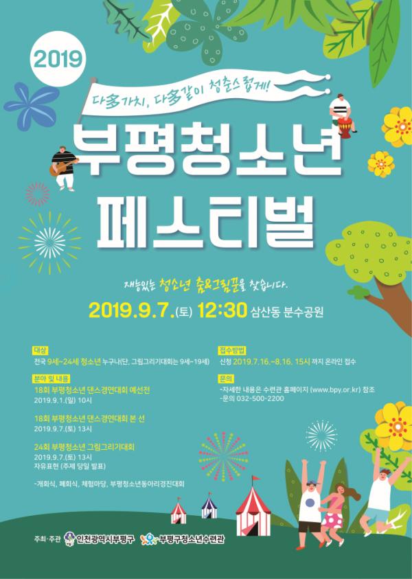 부평구와 부평구청소년수련관이 주최·주관하는 2019 부평청소년 페스티벌이 오는 9월 7일에 삼산동 분수공원에서 열린다.