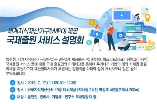 국제출원을 활성화하고 우리기업의 해외 지재권 보호를 강화하기 위해 마련된 이번 설명회에서는 WIPO 전문가가 직접 우리나라에 찾아와서 WIPO의 국제특허, 상표, 디자인 출원 시스템의 장점, WIPO의 특허검색엔진, 상표검색엔진 등과 같은 검색툴에 대한 이용방법을 소개할 예정이다.
