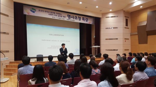 이번 특강은 경희대학교 행정학과 김태영 교수의 강의로 최근 이슈가 되고 있는 사회적 가치에 대한 이해와 공무원으로서 실천해야할 사회적 가치에 대해 2시간 동안 진행했다.