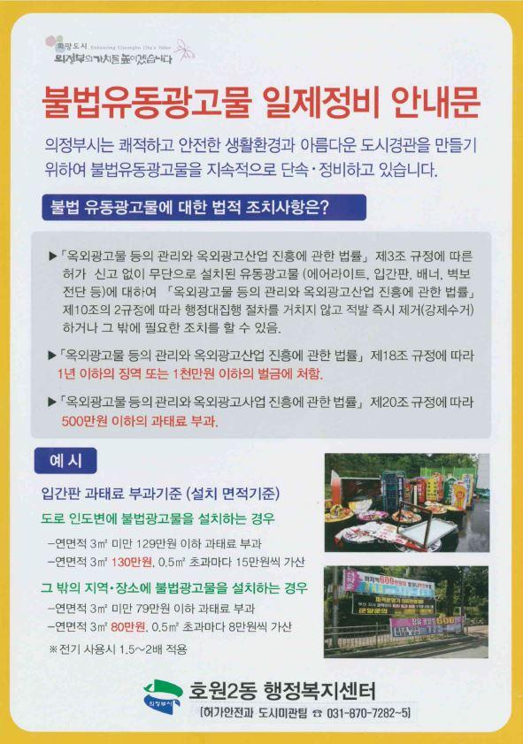 의정부시 호원2동 허가안전과는 지난 상반기에 이어 하반기에도 통행량이 많은 호원권역 내 1호선 전철역 주변 등 주요 인도 위에 무분별하게 설치되어 있는 불법 입간판을 일제 정비할 예정이다.
